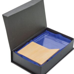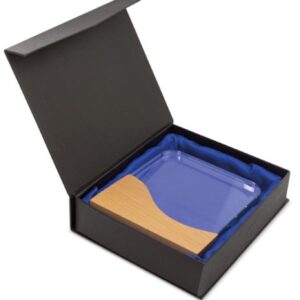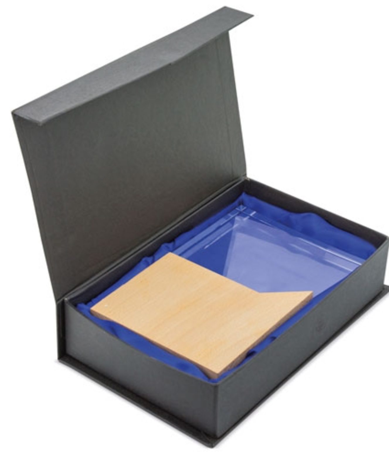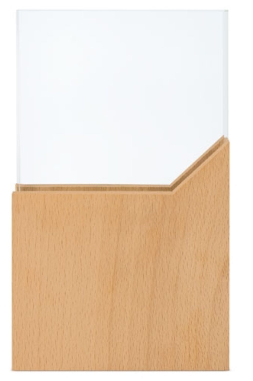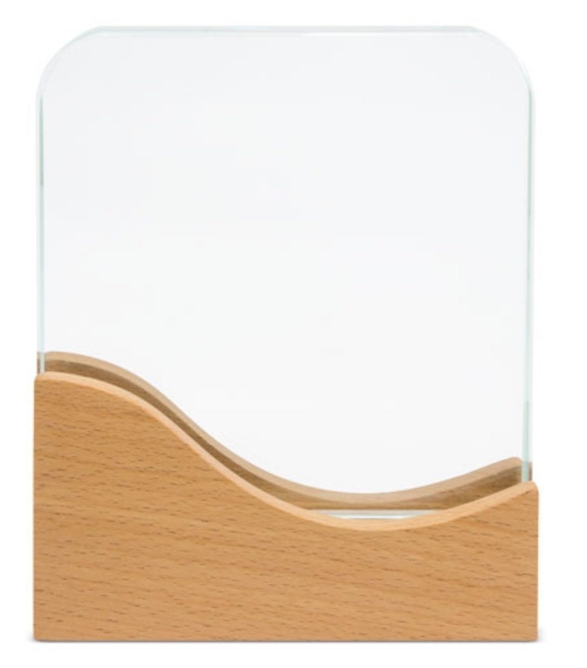 Fabricada en cristal de alta calidad y montada sobre una peana de madera maciza, ofrece un diseño moderno y profesional que realza cualquier imagen o mensaje.